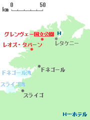 グレンヴェー国立公園 レオの店を後にした移動のバスは、R251号線に入った。正面左手から標高749メートルのエリガル山(Erringal)。右手奥から標高680メートルのスリーブ・スナハト山(Slieve Snacht)が出迎える。ドネゴール2大高峰だ。20キロほど進むと、グレンヴェー(Glenveagh)国立公園に出た。