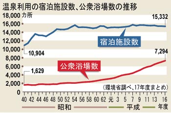 とはいえ、環境省が平成17年度にまとめた資料では、温泉が利用できる公衆浴場は16年度に過去最多の7294カ所に上った。逆に、温泉を備えた宿泊施設は過去10年で最も少なくなり、1万5332カ所。では、宿泊型の温泉施設は魅力が薄れたのだろうか。
