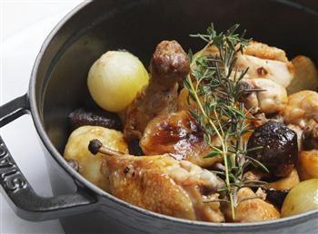 フランスの鍋料理の最大の特徴は水をほとんど使わない点。ほうろうや鉄などの底が平らで厚みがある保温性が高い鍋を使うので、食材の持つ水分で蒸し煮ができ、素材のうまみを100%生かせるという。