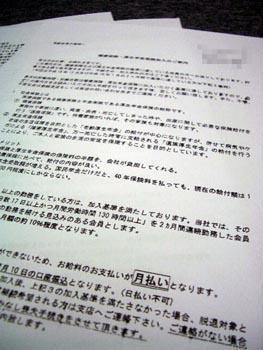 日雇い派遣の事業者から送られてきた厚生年金保険の加入案内。日雇い派遣で働く福岡県の武田奈緒子さん(40)=仮名=は、一回り大きめの文字で強調された「月払い」のフレーズに、理不尽さを覚えた。
